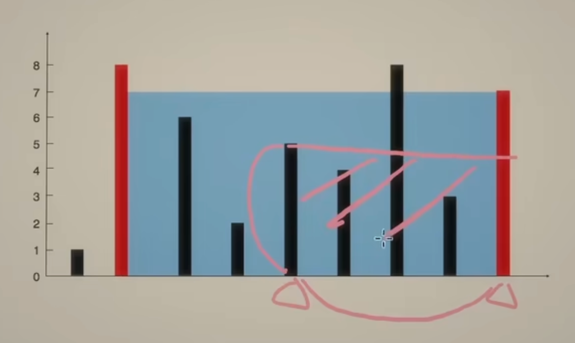 - 原理:某一位置能接的水量 = min(左侧最高, 右侧最高) - 当前高度。
