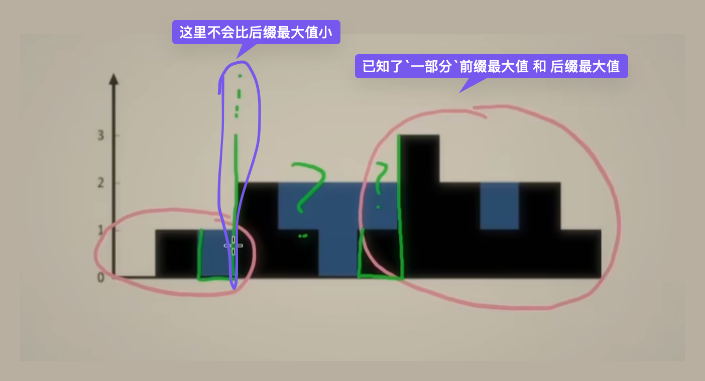 - 存储最左边到i个位置的最大高度 【0,1,1,2,2,2,2,3,3,3,3,3】