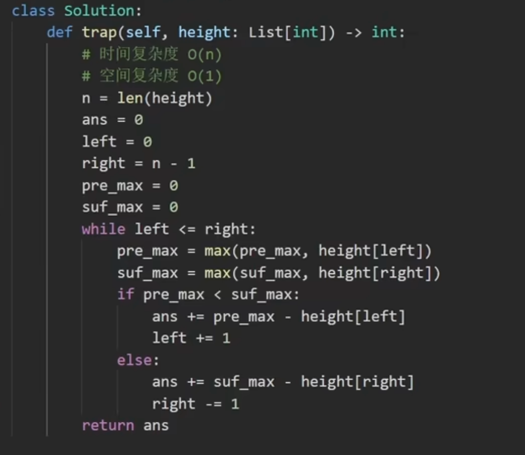- 优化:用双指针 + 前缀最大/后缀最大动态维护,不需要额外数组。