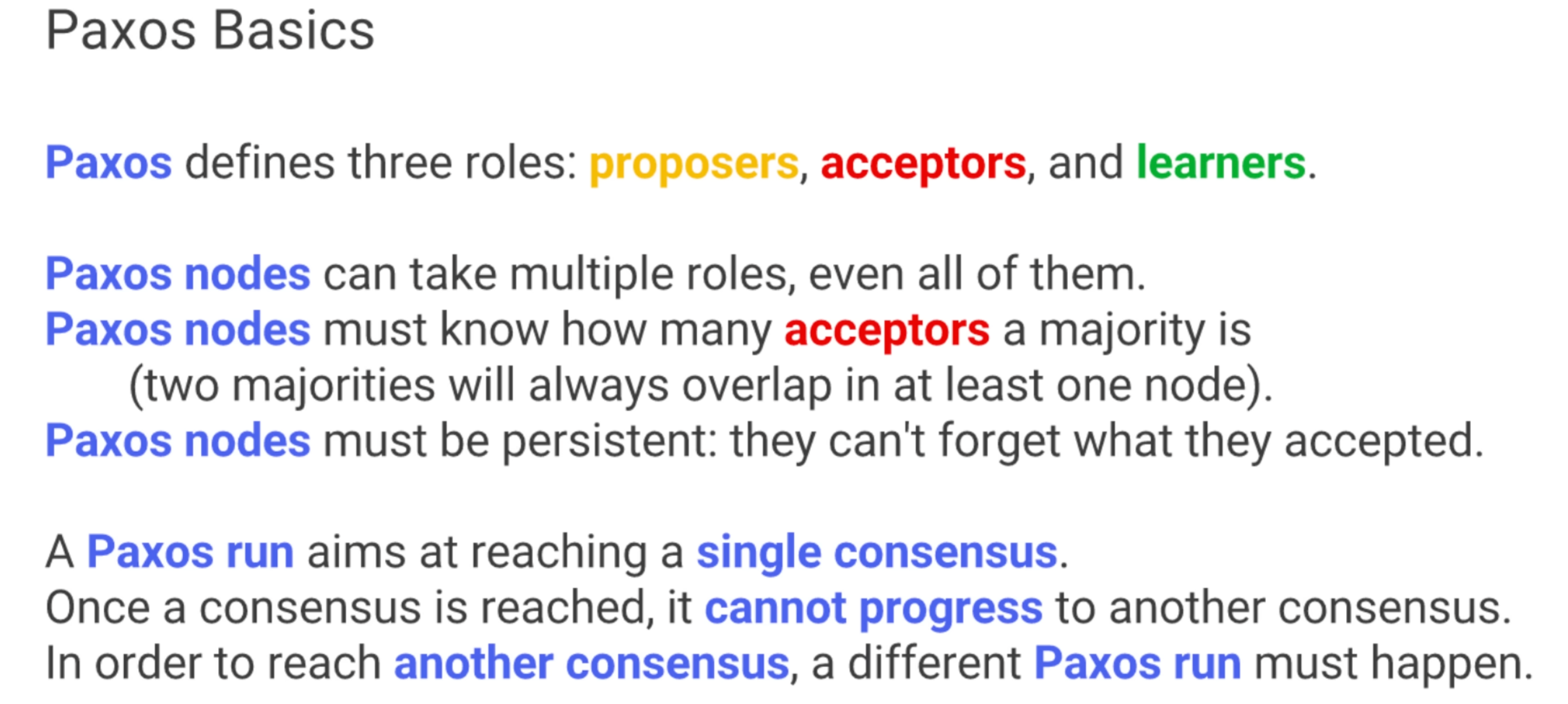 - Acceptor: 参与决策,可以理解为存储节点,回应Proposers的提案。收到Proposal后可以接受提案,若Proposal获得多数派Acceptors的接受,则称该Proposal被批准。