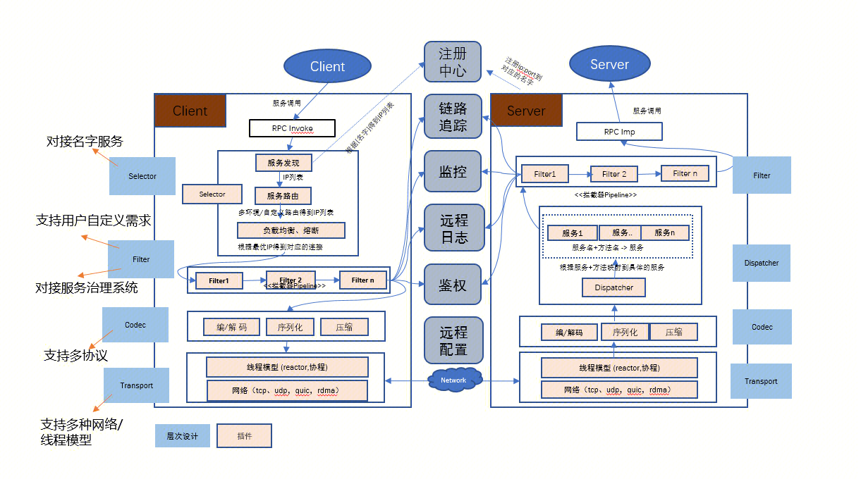 在这张图中,我们新增了一层Filter层(拦截器),其主要目的是采用AOP的思想,把业务个性化的需求(比如:校验校验、请求回放、故障注入等)、以及服务治理的大部分功能(比如:监控指标上报,调用链跟踪,远程日志,鉴权等)以横切关注点的方式,插入到请求/响应处理的流程中,通过这样的设计来增强框架的可扩展性。